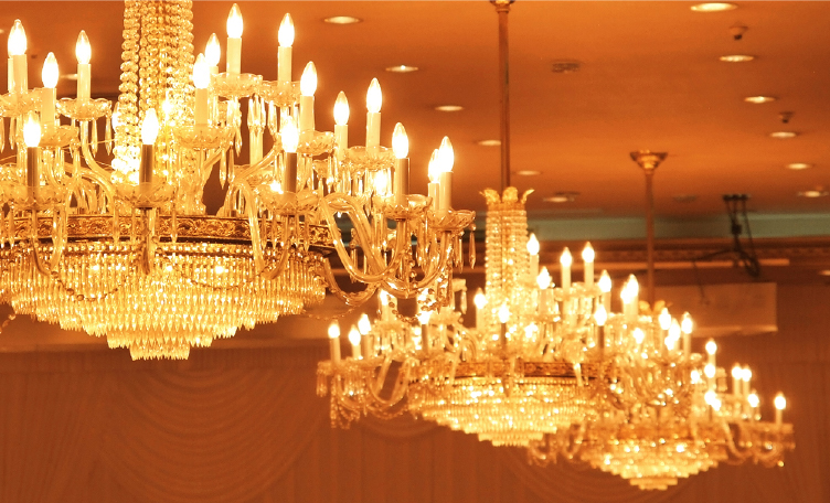 豪華なシャンデリアと高い天井が魅力のバンケットルーム。