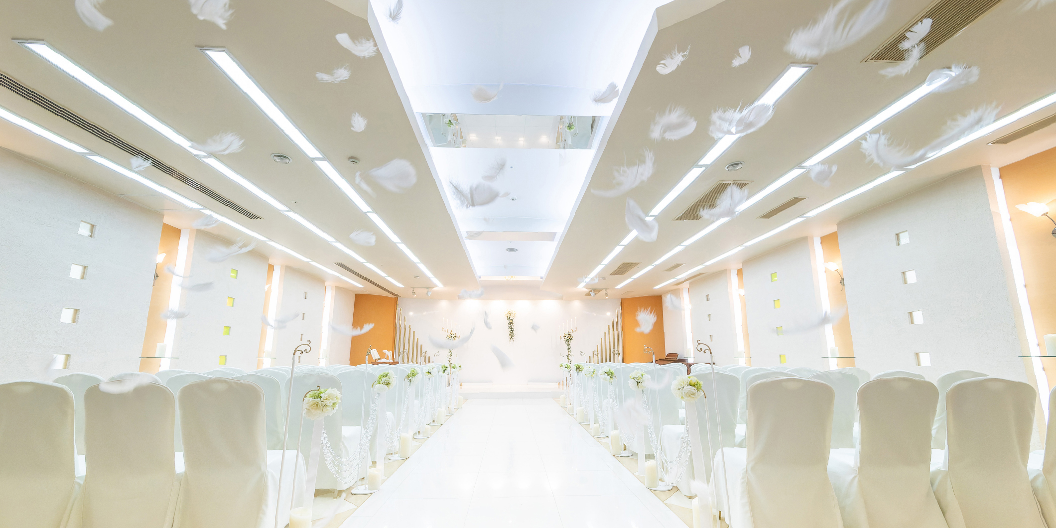 光のイリュージョンに彩られたバージンロードが幻想的に浮かび上がり、